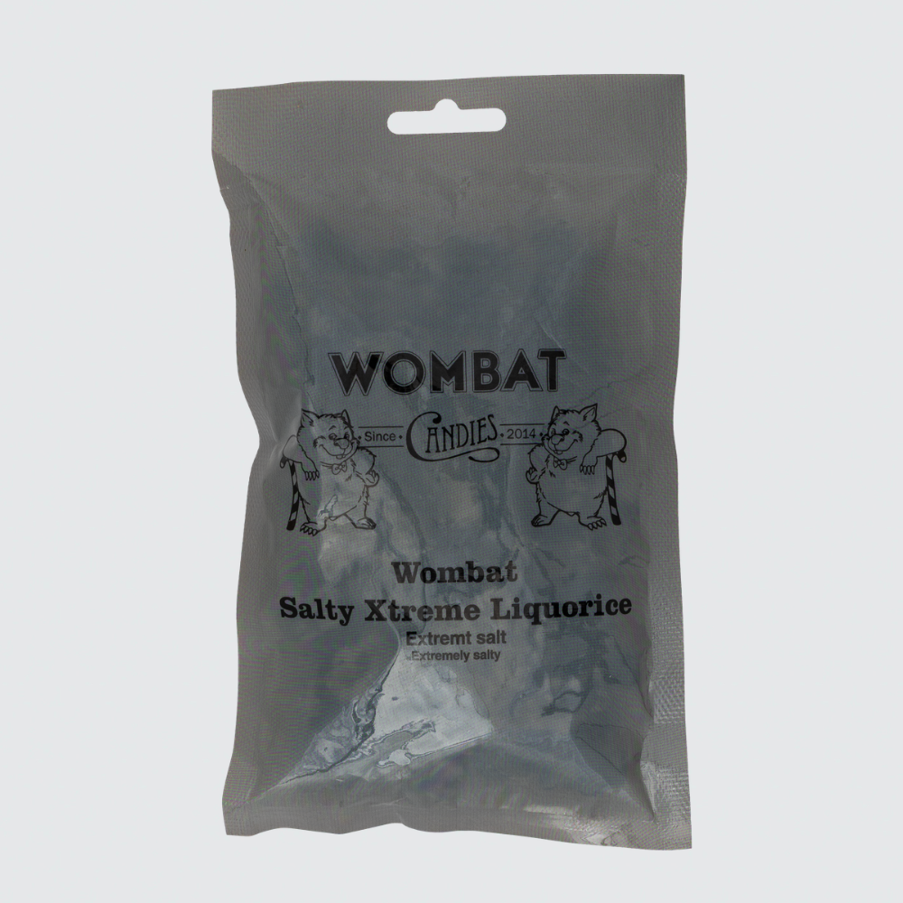 Små mjuksega saltlakritsfigurer formade som björnar rullade i salmiaksalt. Wombat är helt glutenfri och gelatinfri.